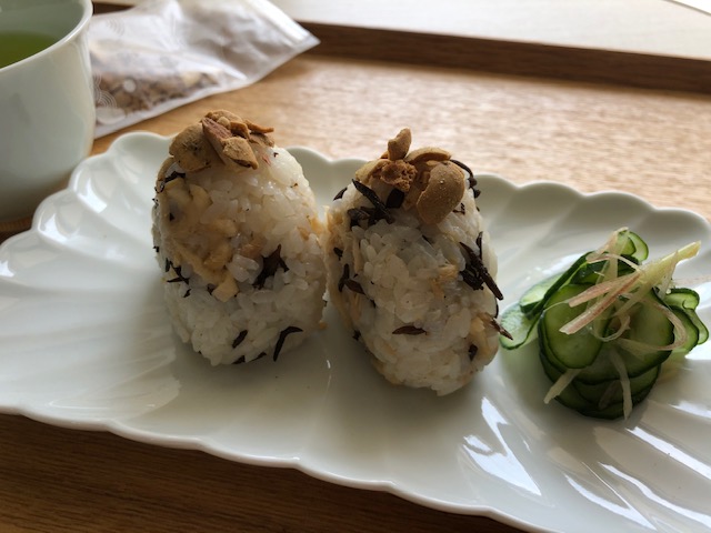 切り干し大根とひじきとシーチキンの和え物をお握りに混ぜて豆菓子のクラッシュをトッピング