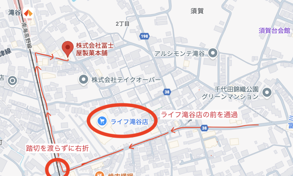 ナビに出てくる道ではなく“ライフ滝谷店”の前を通過し