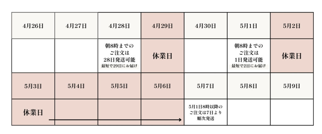 【GW休業】5月2日〜6日は休業となります。ご了承くださいませ。発送日などの《詳しくはこちら》 4月29日(水)休業日5月2日(土)〜6日(水)休業日 5月2日から、5月6日の間で商品をご入用の方は【5月1日(金)の朝8時までにご注文・決済完了をお願いいたします】*銀行振込やコンビニ支払いは、お支払いの確認が取れましたら注文が完了となりますので、当日発送は致しかねます。それ以降のご注文は、5月7日より順次発送させていただきます。*また、締め切り時刻を過ぎてからのご注文はお電話でお問い合わせをいただきましても当日発送はお受けできませんのでご了承くださいませ。 目次